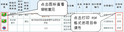 归口管理部门管理员或审批用户在“项目管理—申请书在线审核”栏目可以查看本归口所辖单位上报的项目申请书,进行项目审核并填写审核意见,审核状态包括“通过”、“不通过”。
