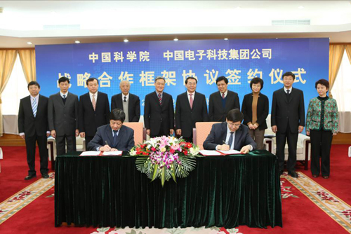 12月20日,中国科学院与中国电子科技集团公司在北京签署战略合作框架协议。中国科学院院长白春礼、中国电子科技集团公司总经理熊群力出席签约仪式并讲话,中科院副院长阴和俊、中国电科集团副总经理毛远建代表双方签署战略合作框架协议。