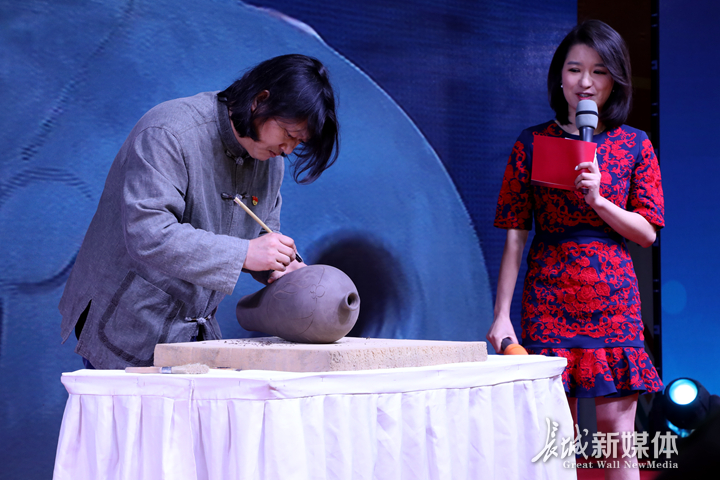 河北曲阳定瓷传承人庞永辉现场展示陶坯刻花技艺。记者 高琳哲 摄