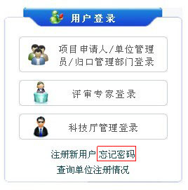 申请人用户由本单位管理员负责管理,密码丢失请联系本单位管理员找回密码。上级归口管理部门和科技厅不直接管理项目申请人。