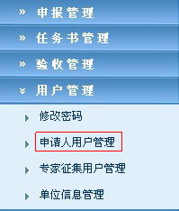 “单位管理员”首先登录本平台,在“用户管理”——“申请人用户管理”栏目为本单位申报人创建登录用户,并将用户名和密码分配给每个项目申请人。