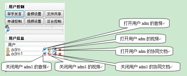 通过英特网(不是政府公务内网)连接上MCU服务器,点击需要查看的终端的音频、视频或者协同浏览的图标,就可以把对方的音频、视频和协同文档进行打开和关闭。如图一: